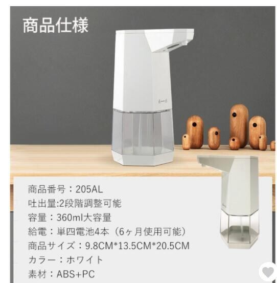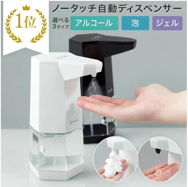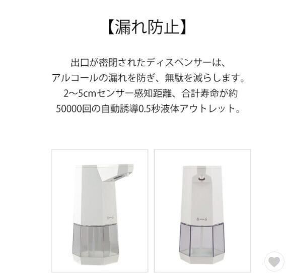 このアルコールディスペンサーは、手指の消毒だけでなく、自動ソープディスペンサーとしても使用可能。泡タイプの液体ソープに対応しており、家庭やオフィスで多用途に活躍します。