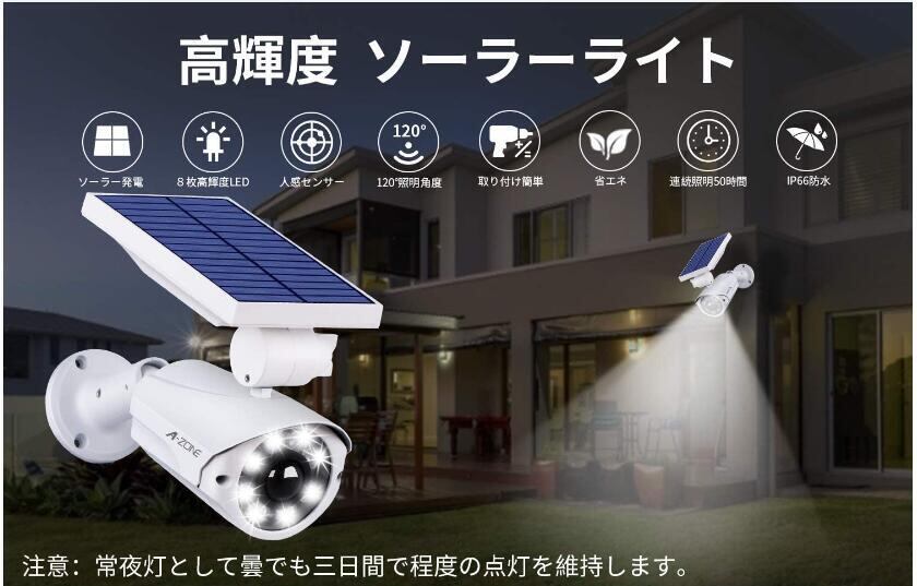 赤いランプが点灯することで、周囲に警戒心を与え、侵入者を防ぐ効果が期待できます。防犯カメラ型デザインはリアリティがあり、より一層の安心をもたらします。